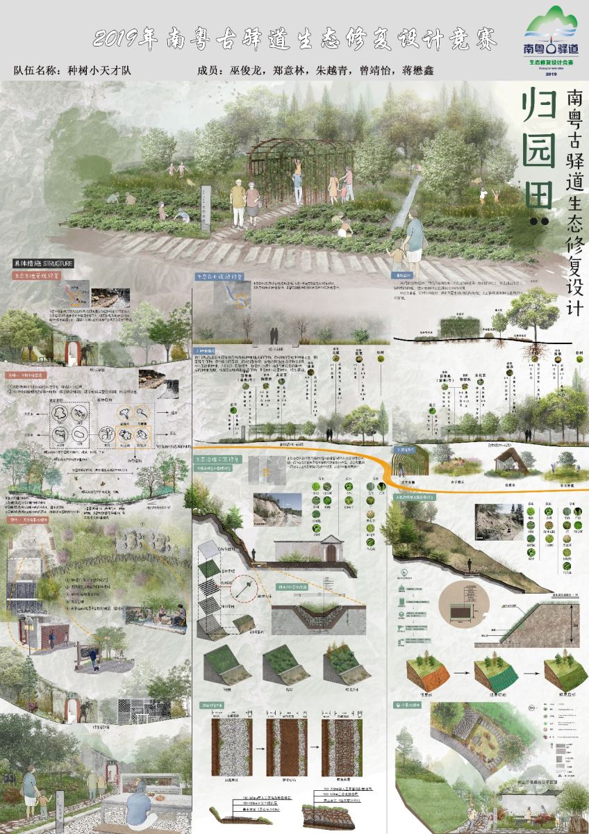 2019年11月28日,广东省 “2019南粤古驿道生态修复设计竞赛”的颁奖仪式在中国科扑克牌射龙门 华南植物园实验大楼报告厅举行。该活动由广东省自然资源厅指导,广州地理研究所、广东省生态学会、广东省土地学会、广东省“三师”专业志愿者委员会、广东省国土空间规划协会、广东省湿地保护协会、广东省土地调查规划院、广东省地质灾害防治协会联合举办,各单位代表、评审专家及参赛队伍成员约130人参加。 扑克牌射龙门 学生作品《归园田——南粤古驿道生态修复设计》(指导老师:肖希老师,学生:巫俊龙、郑意林、朱越青、曾靖怡、蒋懋鑫),荣获大赛唯一的一等奖。《拾古记——南粤古驿道生态修复设计》(指导老师:陆剑,学生:黄晓彤、陈蔓曼、陈晓燕、蔡敏杰、刘卓贤),荣获二等奖。 本次竞赛活动从前期筹备调研到颁奖历时半年,分为高校组和专业组,赛程包括海选、现场调研、竞赛答辩、最终作品提交以及颁奖等主要阶段。参赛队伍针对从化钱岗古道,南雄梅关古道,河源粤赣古道(和平段),清远英德古驿道、阳山古道等5条南粤古驿道重点线路开展了生态修复设计竞赛,设计作品展示了扎实的设计功底、卓绝的设计能力和独到的设计视角。竞赛队伍是从25支高校组队伍、16支专业组通过海选的方式由专家评审产生的。正式参赛的高校组和专业组队伍通过两轮竞赛和网络投票的形式各竞赛出一等奖1支、二等奖2支、三等奖3支、优秀奖(高校组5 支,专业组4 支)。 《归园田——南粤古驿道生态修复设计》图纸 《拾古记——南粤古驿道生态修复设计》图纸