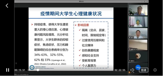 积极响应学校心理健康教育与咨询中心号召,组织全院心理委员参加中国心理学会心理危机干预工作委员会以及全国高校心理委员研究协作组于2022年4月9-10日面向全国高校开展“抗击疫情全国心理委员大讲堂”系列公益讲座。与会专家们从个人、同学、家庭等方面指导学生积极进行心理调适和幸福感提升。