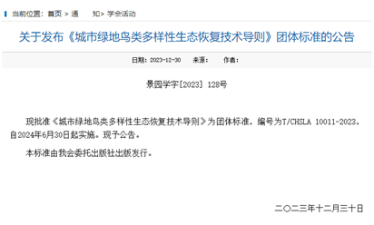 中国风景园林学会于2023年12月30日正式发布《城市绿地鸟类多样性生态恢复技术导则》团体标准,编号为T/CHSLA 10011-2023,自2024年6月30日起实施。这一标准旨在为城市绿地的鸟类生态恢复提供科学指导,并推动城市绿地建设与保护工作。该导则由我校牵头编制,参编单位分别为广东省科扑克牌射龙门