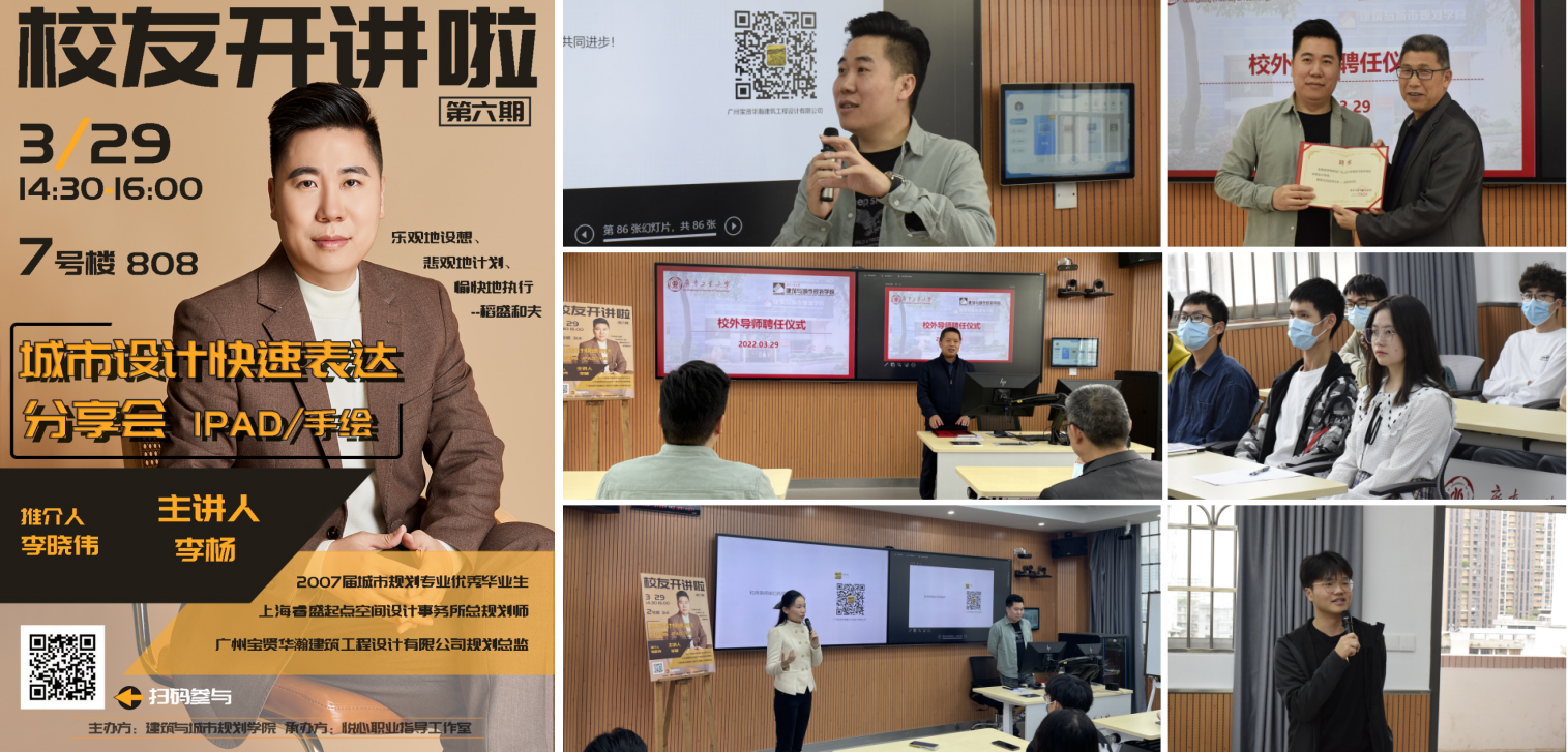 大力引入校友资源,分期分类分主题开展6期《校友开讲啦!》活动,分别邀请广州市设计院集团有限公司总经理助理、第三建筑设计院院长白帆,广东天元建筑设计有限公司总经理张晓聪,广州市睿合建筑设计有限公司执行董事黄天颖,广州宝贤华瀚建筑工程设计有限公司规划总监李杨,广州市思翰城市规划设计有限公司设计总监黄世文,格罗宁根大学博士潘泽强到校与学生交流。